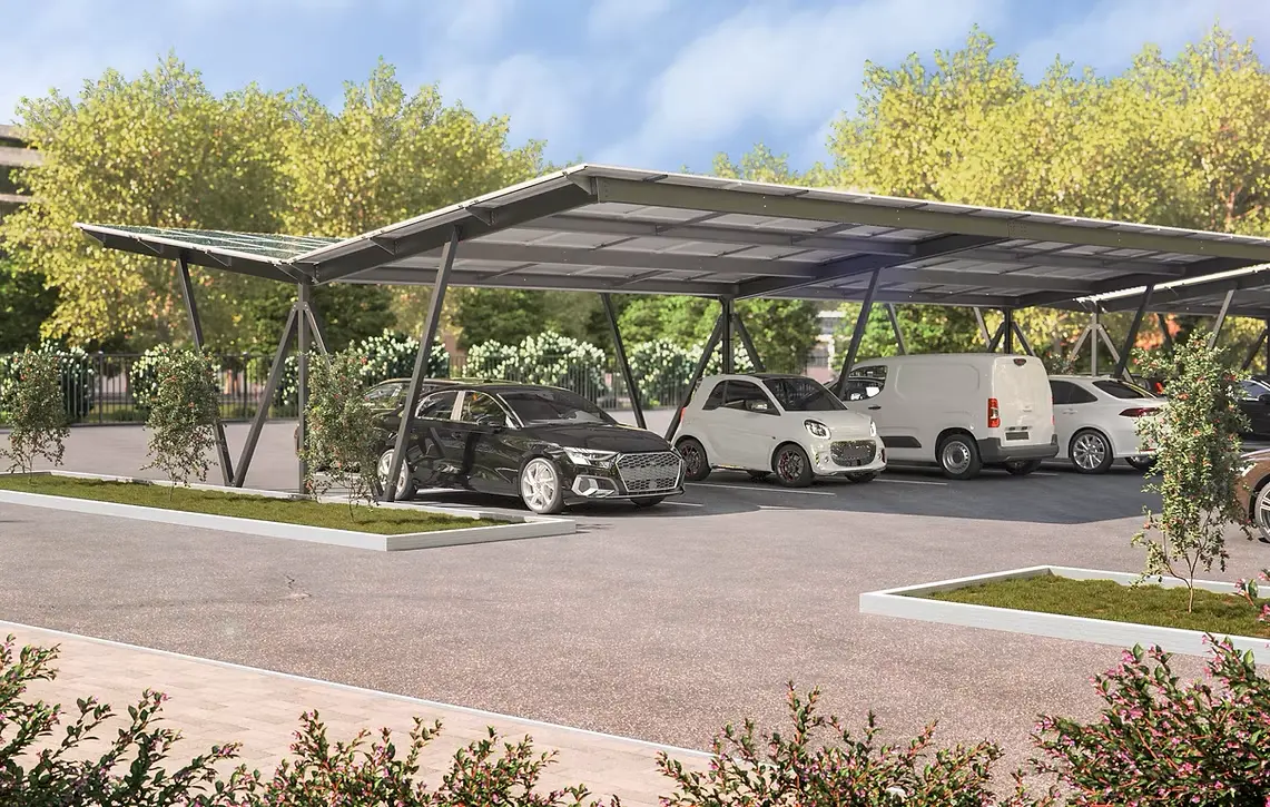 Elk parkeerterrein is anders. Daarom is de SolumbraMatic ontworpen met een modulaire opbouw die zich aanpast aan elke configuratie. Of u nu een klein parkeerterrein heeft bij uw kantoor of een groot terrein bij een supermarkt: de carport past zich aan. Ook qua personalisatie zijn er mogelijkheden, zoals kleuren die aansluiten bij uw huisstijl.
